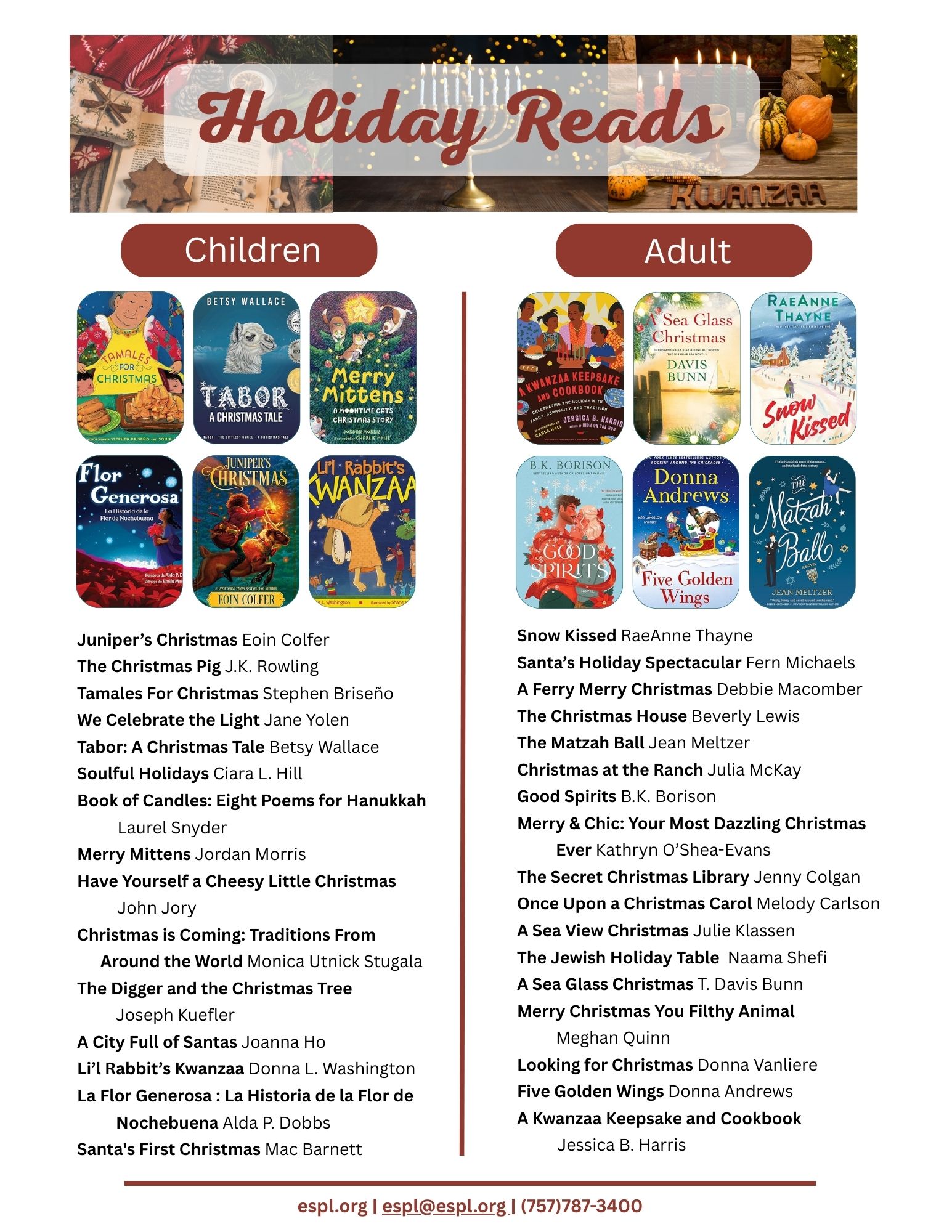 Click here to print a special holiday selection of books celebrating Christmas, Hanukkah, and Kwanzaa!